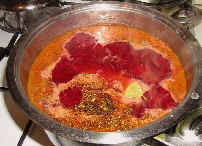 - We koken de rode biet in varkensbouillon. Voeg hele uien toe aan de bouillon. Je kunt zowel aan het begin als aan het einde zout aan de soep toevoegen, eventueel op smaak brengen met andere smaakmakers.