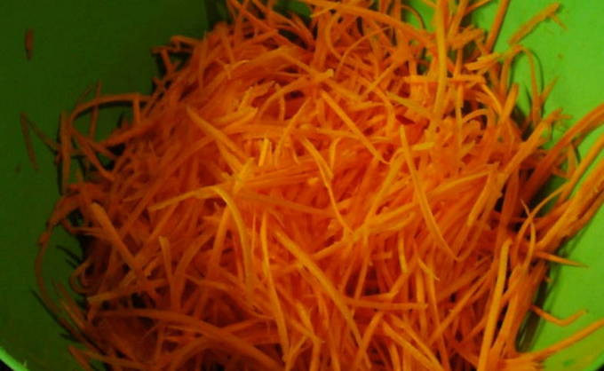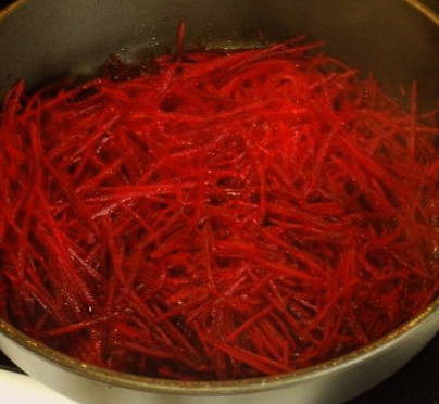 - Schil de bieten en rasp ze om wortelen in Koreaanse stijl te maken. We sturen gehakte bieten naar een voorverwarmde pan.