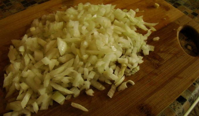 - Snijd voor het bakken de ui en knoflook met een mes.