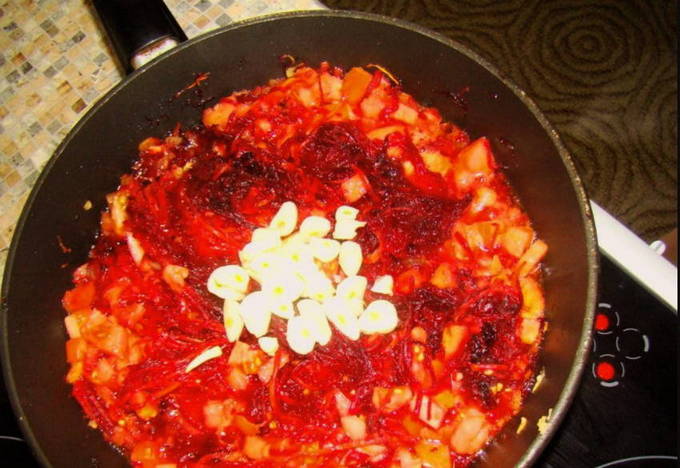 - We controleren de gereedheid van aardappelen en granen, waarna we gehakte bieten en laurierblaadjes toevoegen. In de winter kunt u ingeblikte bladeren gebruiken.