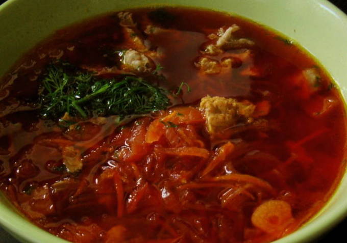 We sturen aardappelsticks naar de bouillon en koken tot ze half gaar zijn. Later voegen we kant-en-klaar frituur en bonen toe. We brengen de afgewerkte rode biet naar de smaak die je nodig hebt, met kruiden en zout. Laat sudderen op laag vuur, bepaal de bereidheid door de zachtheid van de aardappelen. Aan het einde laten we 20 minuten trekken. Schenk gerust hete rode biet in porties en serveer.