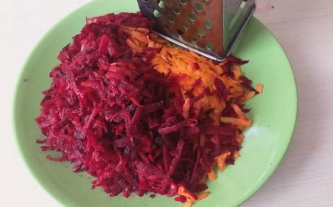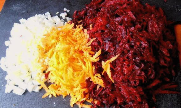 - We verspillen geen tijd en gaan verder met het hakken van groenten om te frituren. Wrijf de geschilde bieten met wortelen op een grove rasp, snijd de aardappelen in blokjes.