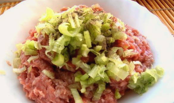 - Om de gehaktballen te bereiden, maal alle greens, groene uien en voeg ze toe aan het gehakt. Zout gehakt, peper en meng goed.
