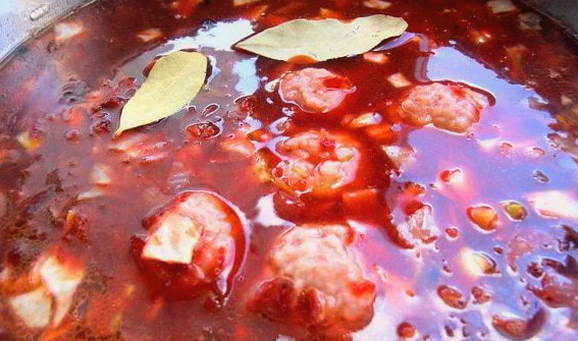 - We controleren de gereedheid van de gehaktballen en voegen het afgewerkte frituren toe aan de bouillon. Zout, peper en voeg naar smaak laurierblaadjes toe.