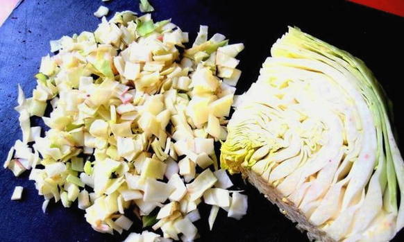- Snijd vervolgens de ui in kleine blokjes en voeg toe aan de groenten.