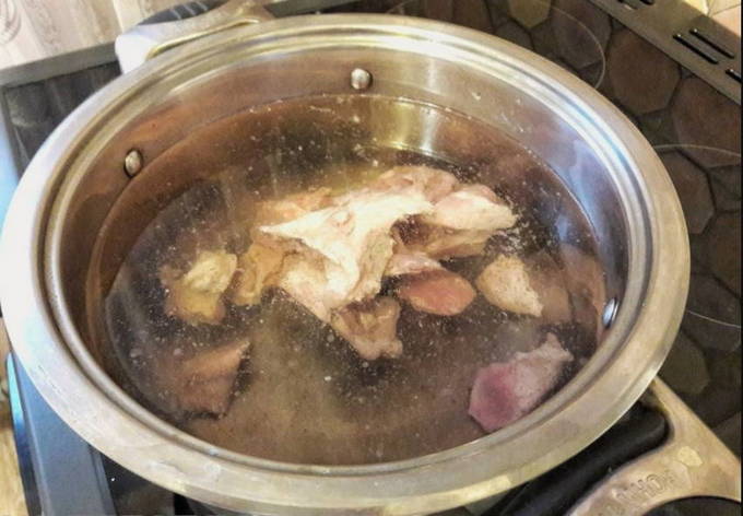 - Was het vlees en stuur het in zijn geheel in een pan met verwarmd water. Breng aan de kook en voeg een beetje zout toe. Zorg ervoor dat u het schuim van het oppervlak verwijdert. Daarna koken we het vlees 30 minuten.