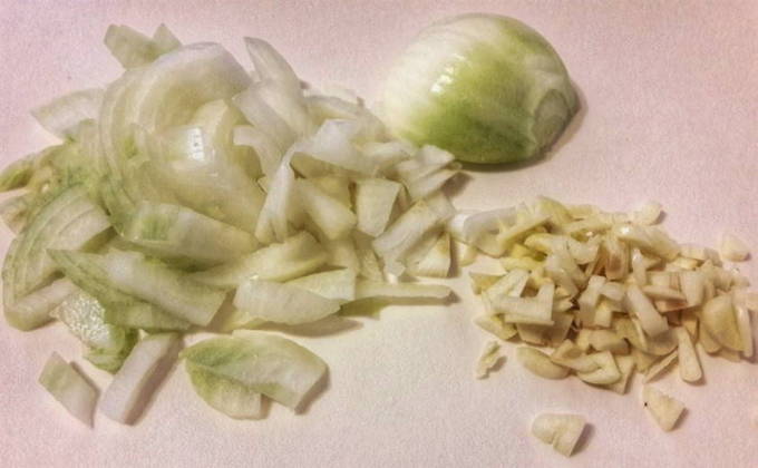 - Snijd voor het bakken de ui en knoflook met een mes.