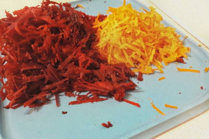 - Schil de wortelen met bieten en wrijf ze op een grove rasp.