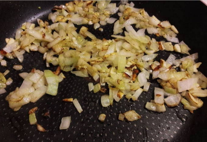- Laten we nu naar het hoofdpodium gaan. We wassen alle benodigde groenten en verwijderen de schil. We malen het op een voor u geschikte manier en sturen het naar een koekenpan die is voorverwarmd met plantaardige olie. Bak tot ze goudbruin zijn, af en toe roeren.