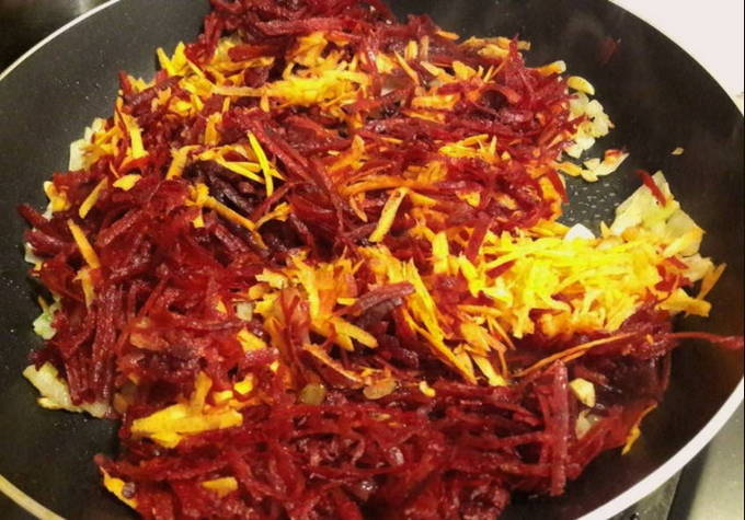 - We sturen de wortels geraspt op een grove rasp in een koekenpan met uien en bak ze drie minuten, voeg dan de bieten toe en bak nog eens 10 minuten, af en toe roeren.