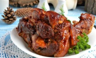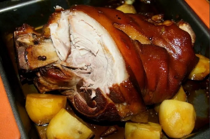 - Haal na de toegestane tijd de sappige en rossige schenkel uit de oven en serveer onmiddellijk met aardappelen, groenten, kool.