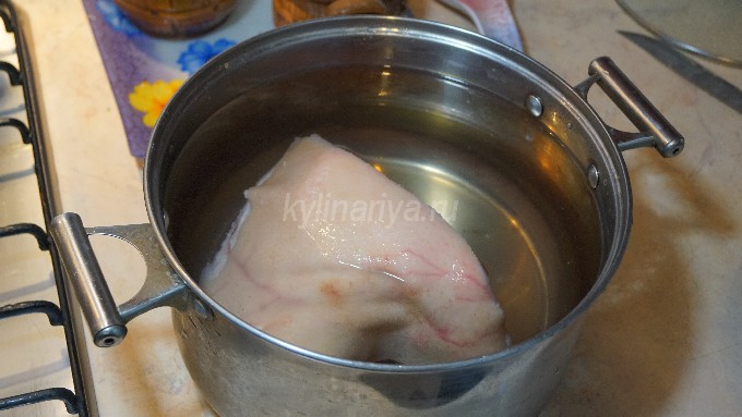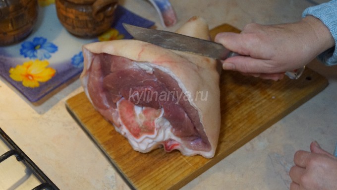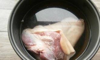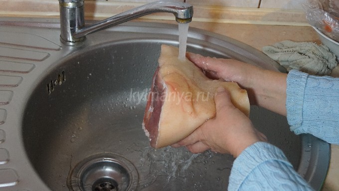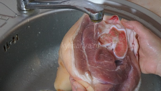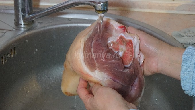 - Leg de verse varkensschenkel in gezouten schoon water en laat het een paar uur weken. Schraap daarna al het vuil van de huid en spoel de schacht grondig af onder de kraan met stromend water.