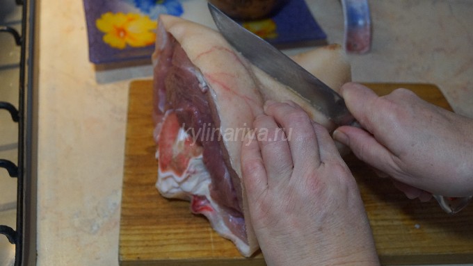 - Leg de verse varkensschenkel in gezouten schoon water en laat het een paar uur weken. Schraap vervolgens al het vuil van de huid en spoel de schacht grondig af onder de kraan met stromend water. Maak een langssnede tot op het bot en snijd het bot uit het vlees. Je kunt het bot in de bouillon laten of weggooien, maar bereid het vlees voor op het bakken.