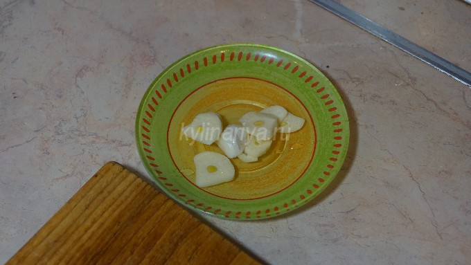 - Snijd de knoflook in plakjes, maak inkepingen op de steel en steek de knoflook in de inkepingen.