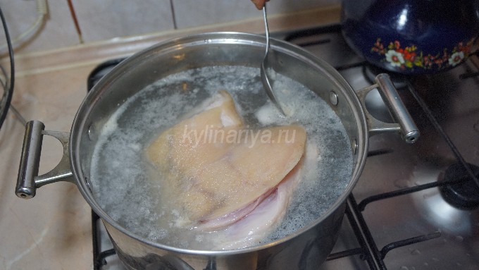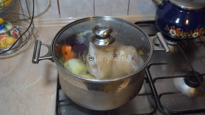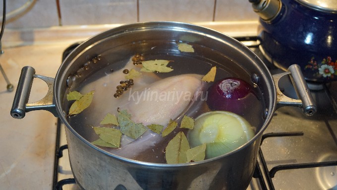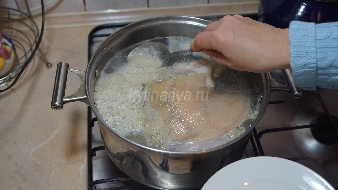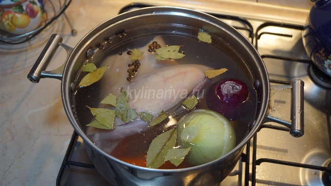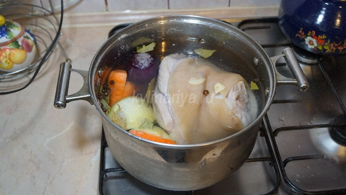 Doe het in een grote pan, giet er schoon water in en breng de schenkel aan de kook. Verwijder daarna al het schuim van het oppervlak van de bouillon, voeg laurierblaadjes, zout, kruiden en een gepelde ui toe.