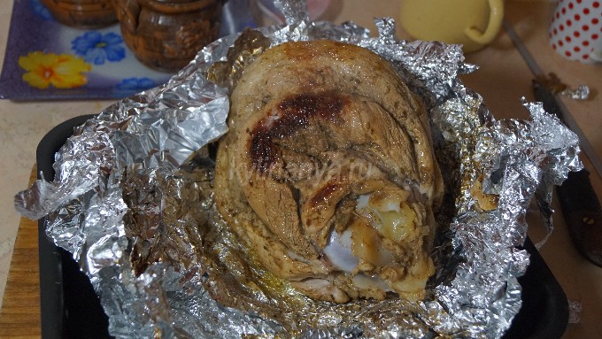 Bedek de schacht met folie en plaats anderhalf uur in een voorverwarmde oven op 180-200 graden. Vergeet niet om de schenkel regelmatig water te geven met bier waarin het in de oven wordt gebakken.