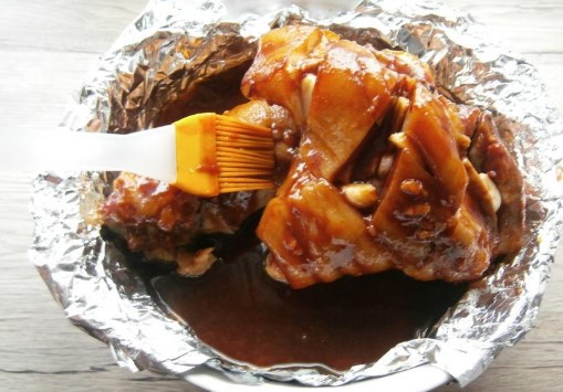 Vet de hele schenkel goed in met saus aan alle kanten en vergeet niet een paar plakjes knoflook in de sneden in de schenkelhuid te leggen.