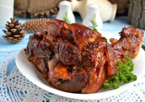 - Haal na de toegestane tijd de sappige en rossige schenkel uit de oven en serveer onmiddellijk met aardappelen, groenten, kool.