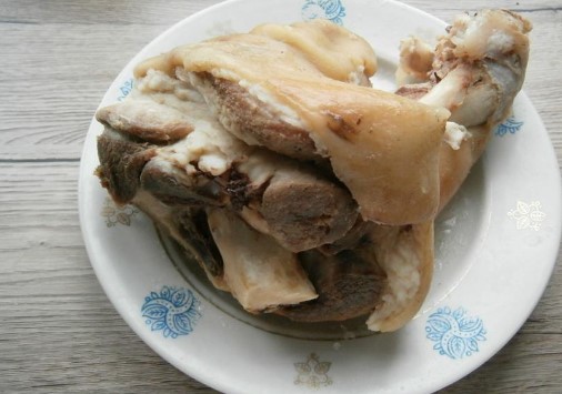 - Eerst moet je de varkensschenkel grondig wassen en koken, wat behoorlijk lang zal duren. Probeer onmiddellijk de schoonste schacht te kiezen, zodat u niet lang hoeft te rommelen met het wassen ervan. Schraap de huid, wrijf grondig met een borstel en spoel het product af onder heet stromend water.