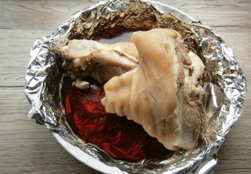 - Bedek de pan met de schenkel met een deksel en kook het gedurende twee en een half uur op matig vuur zodat het vlees de tijd heeft om te koken. Haal de voorbereide schenkel uit de bouillon en laat afkoelen.