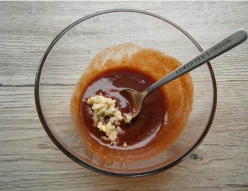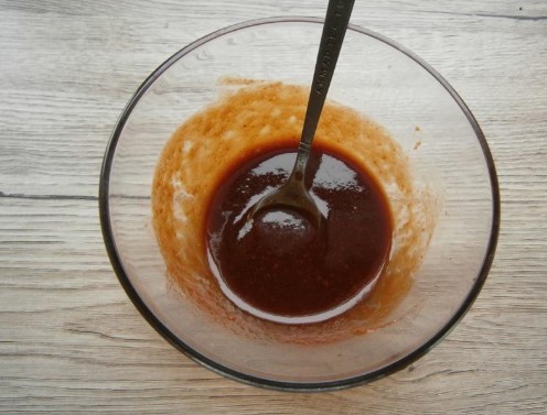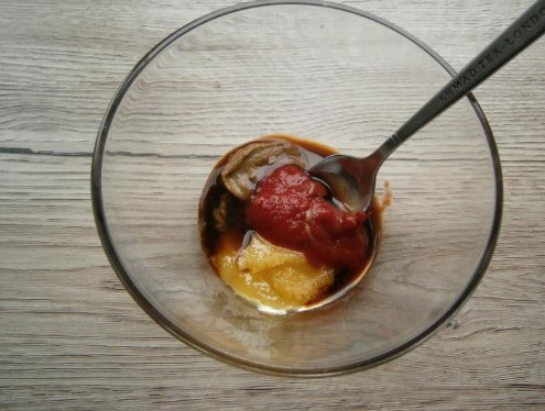 Combineer tomatenpuree, sojasaus, honing en mosterd in een aparte container. Roer de saus goed door met een vork.