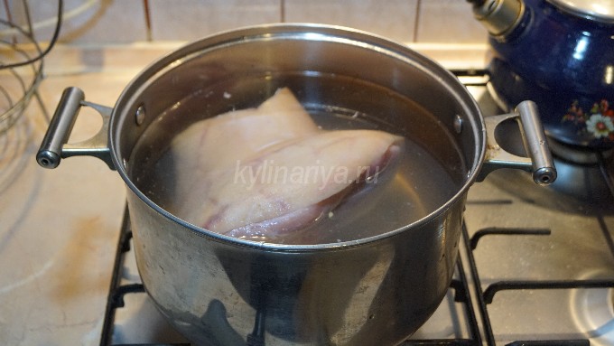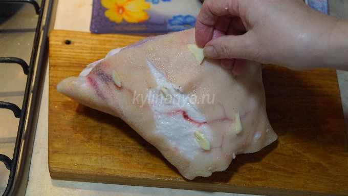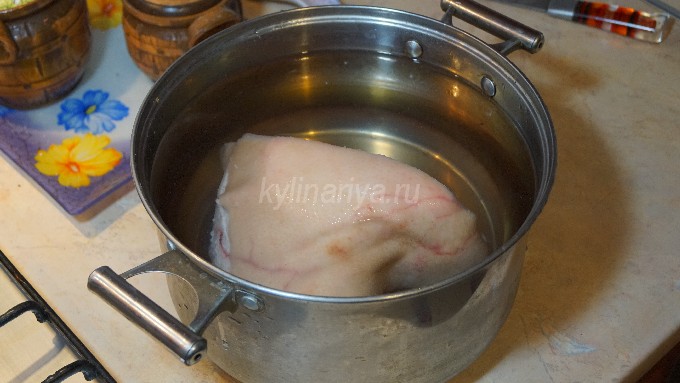 - Leg de verse varkensschenkel in gezouten schoon water en laat het een paar uur weken. Schraap daarna al het vuil van de huid en spoel de schacht grondig af onder de kraan met stromend water.
