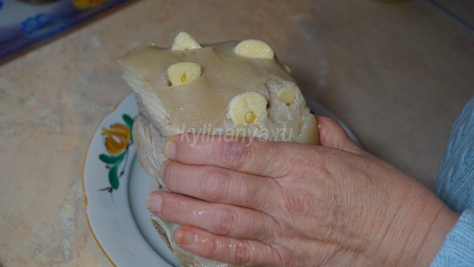 - Maak met een mes gaatjes in de schil en steek daar de stukjes knoflook in.