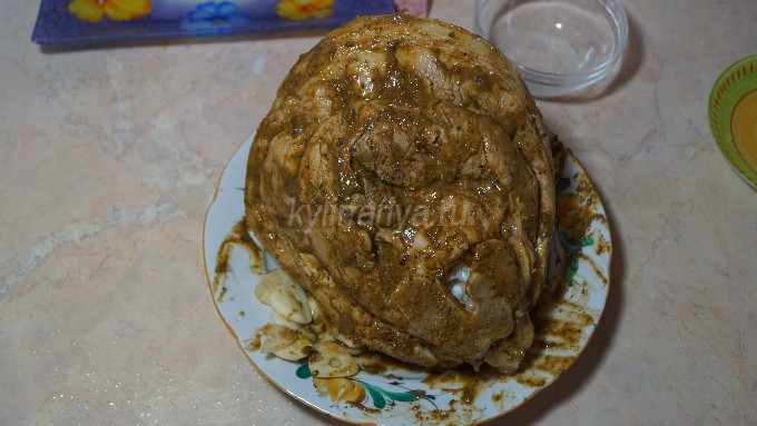 - Wrijf het varkensvlees goed in met peper en zout, bestrooi met een mengsel van kruiden en wrijf het goed in het vlees. Rol vervolgens een rol van de schacht en bind deze vast met katoenen touw, zoals een worst. Doe de schenkel in een bak met deksel en laat een dag in de koelkast staan.