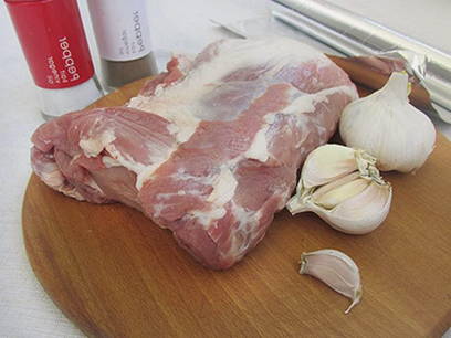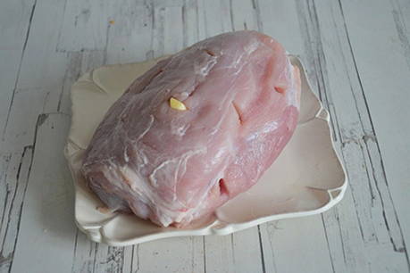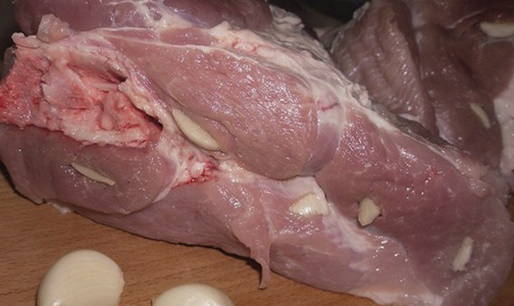 - Was het varkensvlees en dep droog met keukenpapier. Schil 5-6 teentjes knoflook, snijd ze in plakjes. Maak kleine inkepingen in het vlees en steek de knoflook erin.