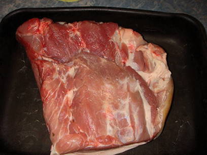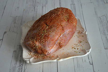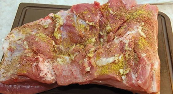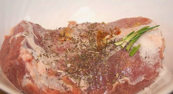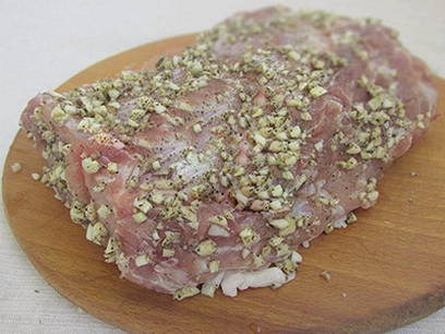 - Was het varkensvlees, droog het en wrijf in met zout, gehakte knoflook en kruiden.