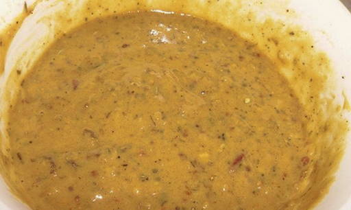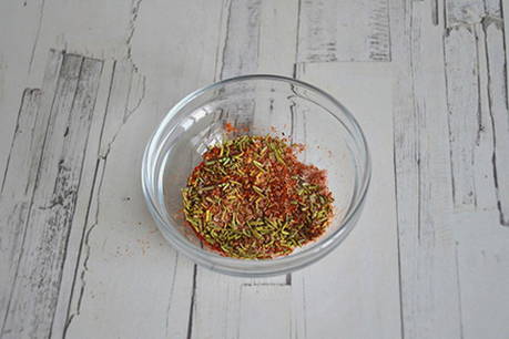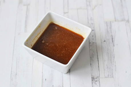 - Meng in een kom de sojasaus, olijfolie, droge knoflook, mosterd en kruiden.