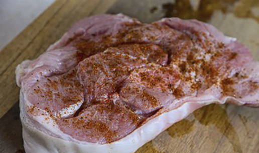 - Rasp een stuk varkensvlees met een pittig mengsel.