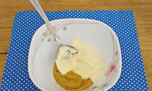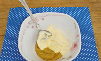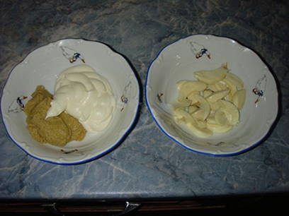 - Pel de knoflook, snij in partjes. Meng in een aparte kom de mosterd, mayonaise, zout en peper.