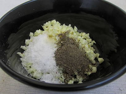 - Pel de knoflook en hak fijn met een mes. Meng in een kom knoflook, zout en gemalen peper.
