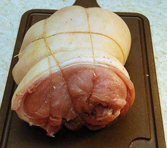 - Rol een stuk varkensvlees in een rol en bind het vast met dikke draden.