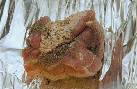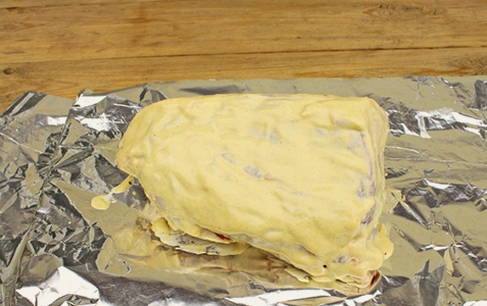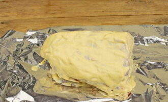 Vouw de folie in twee of drie staande posities. Leg varkensvlees op de folie, bestrijk het met een mengsel van mayonaise en mosterd.