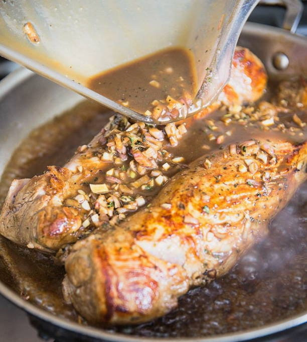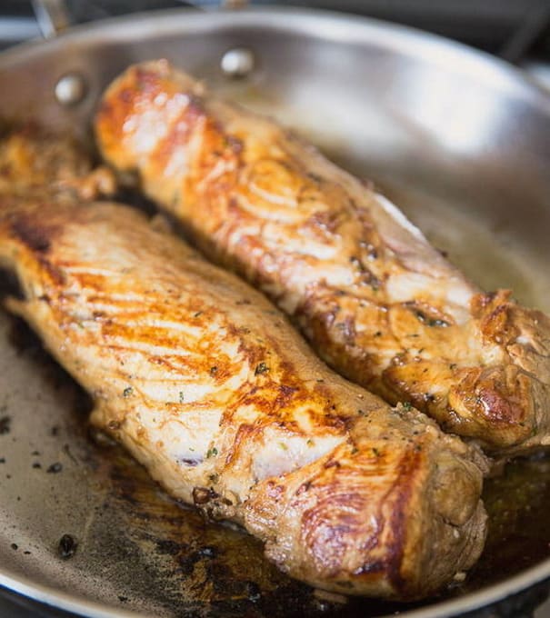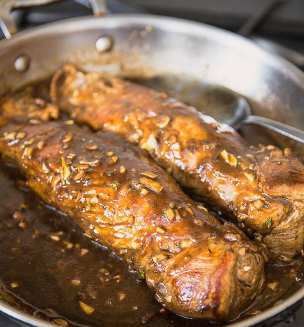 Mals en zacht varkensvlees uit één stuk gebakken met knoflook
