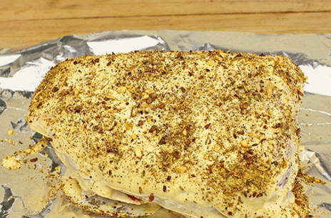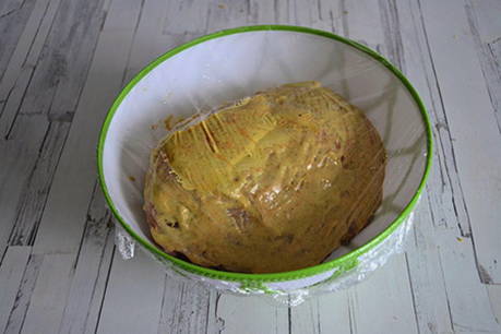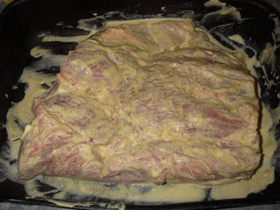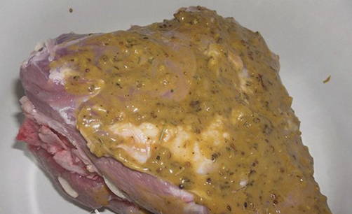 - Breng de mosterd met een siliconenborstel aan op het vlees. Doe het vlees in een kom, dek af met huishoudfolie en marineer 5-8 uur in de koelkast.