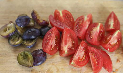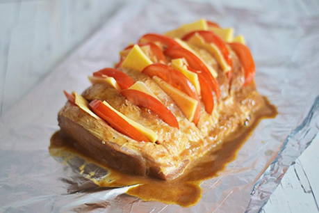 - Snijd de tomaten en kaas in dunne plakjes. Leg plakjes kaas en tomaten in de vleesaccordeon.