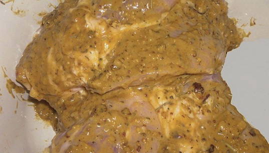 - Meng voor de marinade mosterd, sojasaus, plantaardige olie, wijnazijn, zout en droge kruiden.
