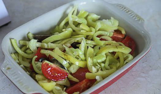 - Doe gehakte groenten in een ovenschaal, bestrooi met zout, voeg gehakte knoflook toe, giet er een paar eetlepels plantaardige olie bij en roer.