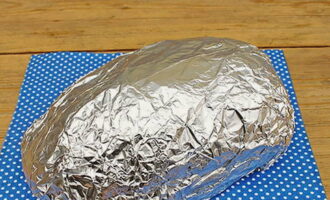 - Wikkel het vlees daarna in folie, leg het op een bakplaat en stuur het naar de oven. Bak 45 minuten op 250 graden.