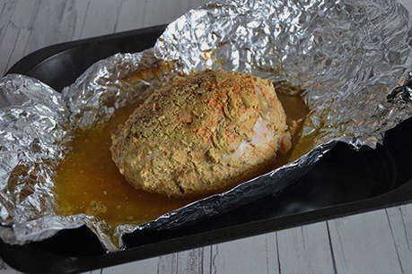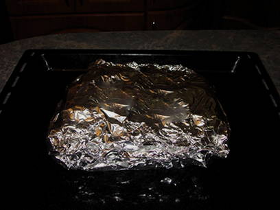- Wikkel het varkensvlees in meerdere lagen folie. Bak het vlees 1-1,5 uur in de oven op 220 graden.