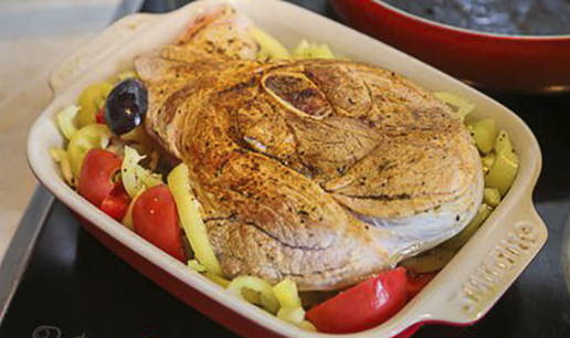- Sappig varkensvlees uit één stuk gebakken met groenten in de oven