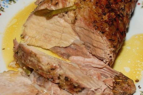 - Varkensvlees in een groot stuk, in een hoes in de oven gebakken