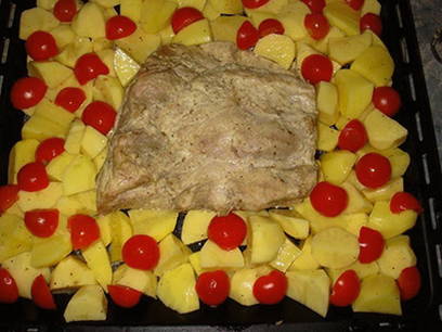 - Aardappelen en tomaten, wassen en in grote blokjes snijden. Rol het varkensvlees uit. Leg het vlees op een bakplaat, verdeel er groenten omheen, zout en breng op smaak.