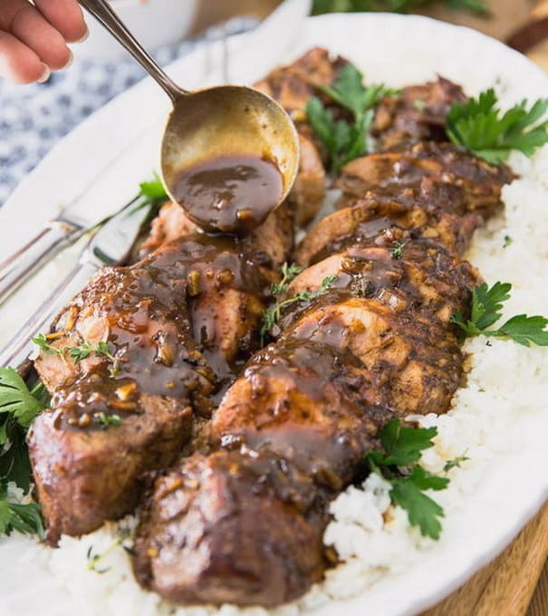 - Sappig varkensvlees in sojamarinade met honing, gebakken in de oven