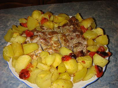 - Varkensvlees gebakken in een groot stuk met aardappelen