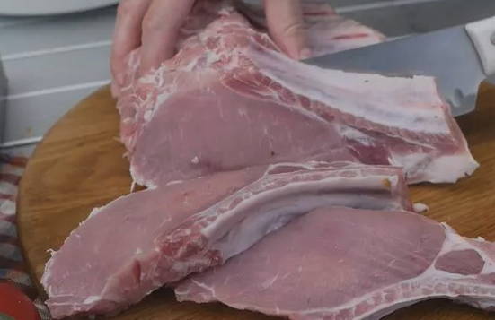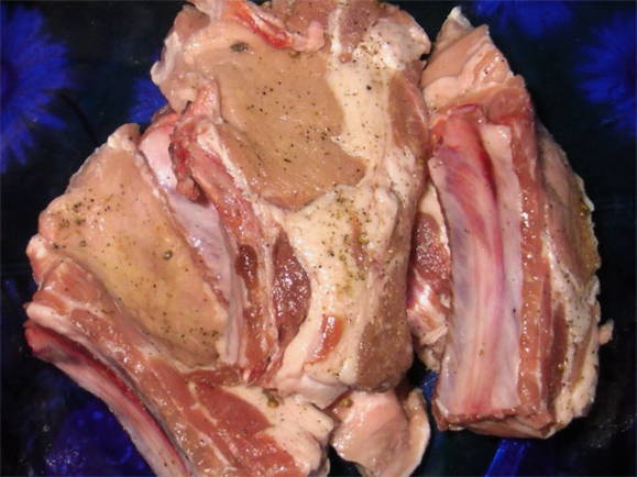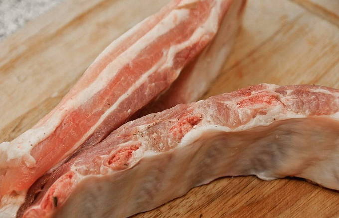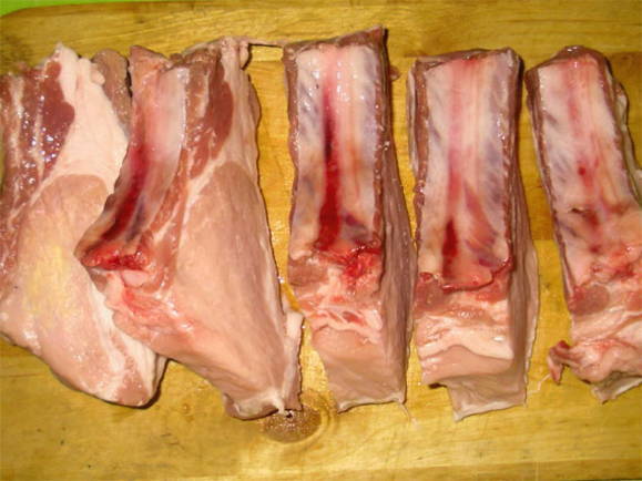 - We wassen de varkensribbetjes en snijden in porties.