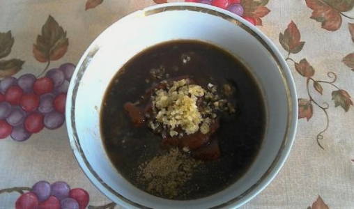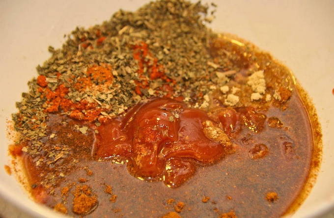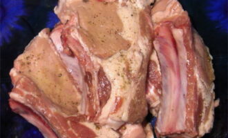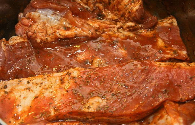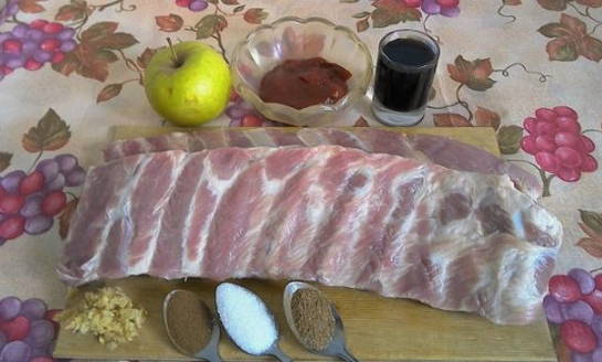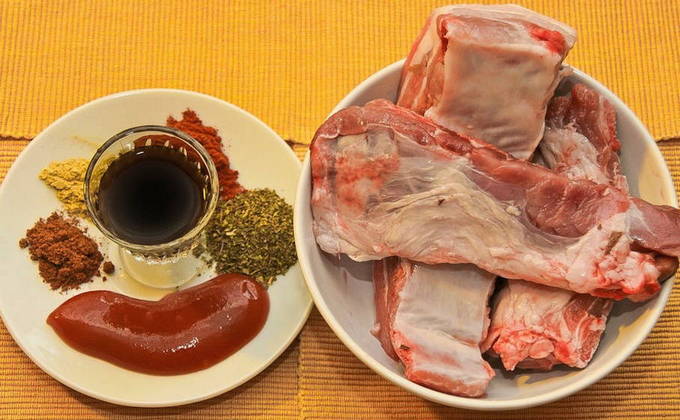 - We mengen alle ingrediënten die nodig zijn voor de marinade. Bedek de ribben er grondig mee en laat ongeveer een half uur op kamertemperatuur staan. Daarna sturen we het vlees ongeveer 5 uur naar de koelkast.